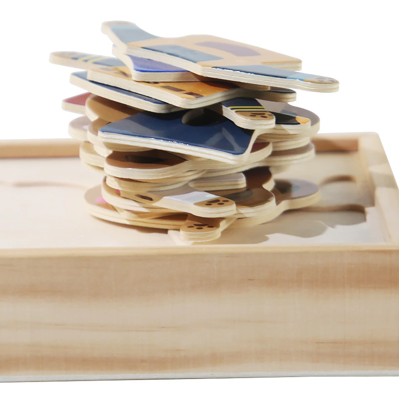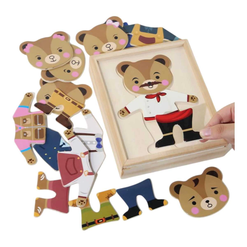 Los niños pueden armar y combinar las diferentes piezas de madera para crear ositos con distintas expresiones y atuendos. Cada combinación invita a imaginar historias, trabajar la motricidad fina y explorar emociones de manera lúdica.